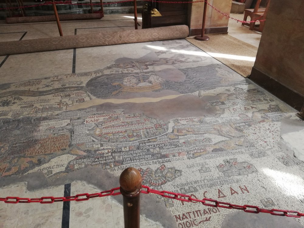 In or around 562 AD, many exquisite mosaic floors were laid in Madaba, including the Chapel of St. Theodore, now part of the Madaba Cathedral. In the Church of the Apostles, a mosaicist named Salamanios completed a masterwork. The oldest and most famous floor, the Mosaic Map, was discovered in 1884 in the Greek Orthodox Church of St. George. It was originally laid in 560 AD. Centering on Jerusalem, the map portrays the region with accuracy and humor. Archeologists have been able to positively identify most of the 150 named sites due to the accurate portrayals of natural features such as the River Jordan or the Dead Sea, as well as the labels. Only one-third of the map has survived.